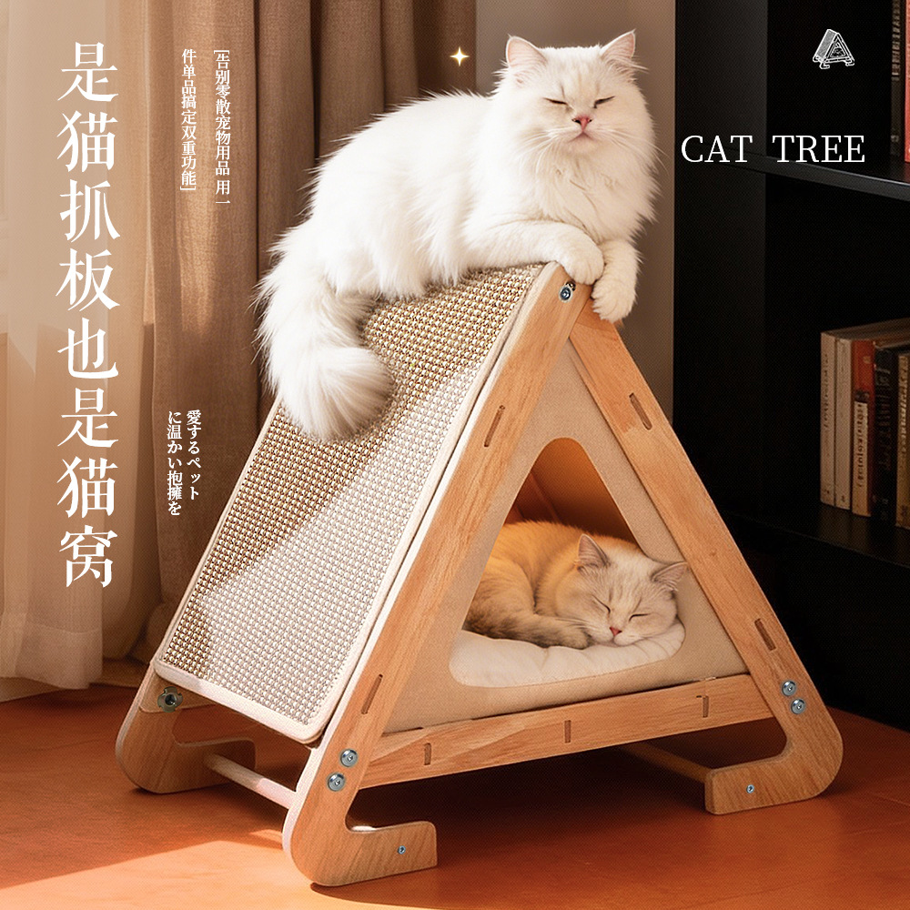 【原木風多功能】三角穩固貓抓板・可折疊收納,一板滿足磨爪+攀爬+睡窩!